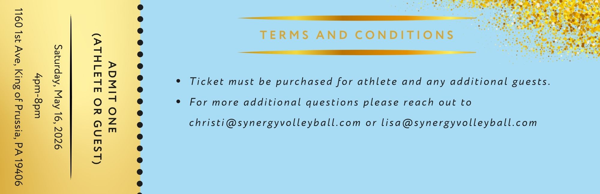 Celebrate the 2026 season with Synergy Volleyball Club at our annual banquet, hosted at the Valley Forge Resort. This ticket includes admission to the banquet event featuring dinner, awards, and season highlights for players, families, and supporters. Open to all club families and select teams/age groups as designated. Purchase online to secure your spot and join us in recognizing our athletes and coaches.